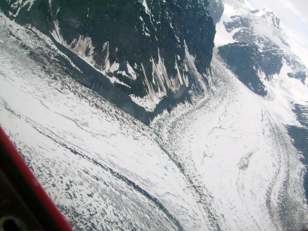 The pilot flew us around the mountain. Then he flew between ice covered granite peaks. I had a too close of a look at the glaciers below and the granite side walls. The walls are steep. I was afraid. I was scared we would crash into them.