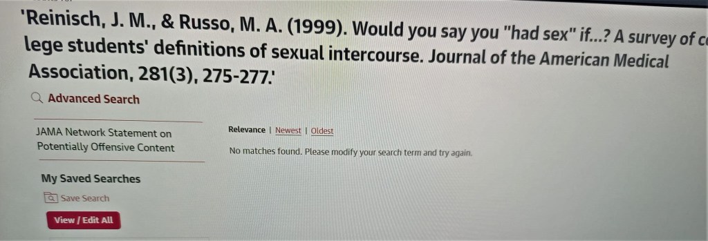 Reinisch, J. M., & Russo, M. A. (1999). Would you say you “had sex” if…? A survey of college students’ definitions of sexual intercourse. Journal of the American Medical Association, 281(3), 275-277.