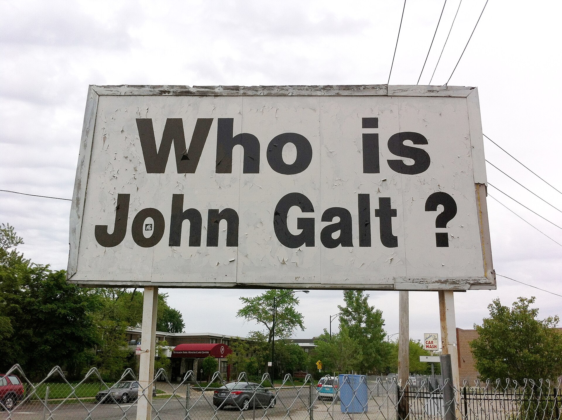 Last time when the presumed presence of John Galt was sort of sighted, it happened around 2015 when the public sign “Who Is John Galt?”, was posted in Chicago IL at about N. Pulaski St. and W. Granville Ave. (See the top photo).